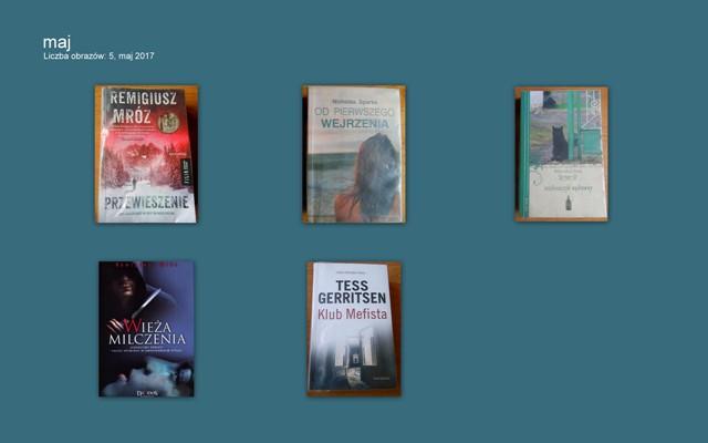 W maju przeczytałam 5 pozycji, 1822 strony, od początku roku 34 książki, 12488 stron.